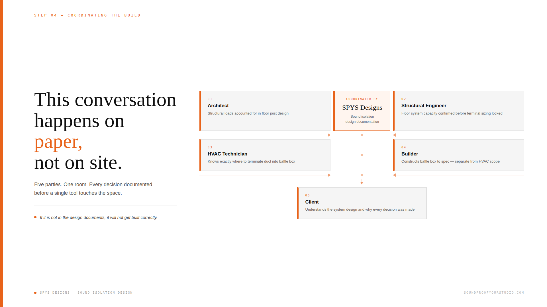 This is the first example of the coordination model in practice. We identified what we needed, specified the standard it had to meet, and handed the execution to the specialist whose domain it is. The HVAC team delivered the numbers. We took those numbers and built the acoustic system around them.
