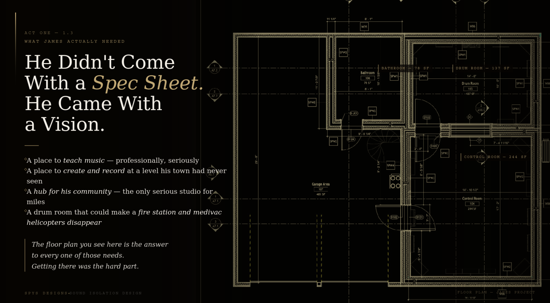 He needed a place to teach music — not a treated room or a hobby space, but a room that could function as a real teaching studio. He needed a place to create and record at a level that did not exist anywhere near his rural community. And he wanted to build something that would become a hub — the kind of space that serious musicians would travel to, that would put his town on the map for recording in a way it had never been before.