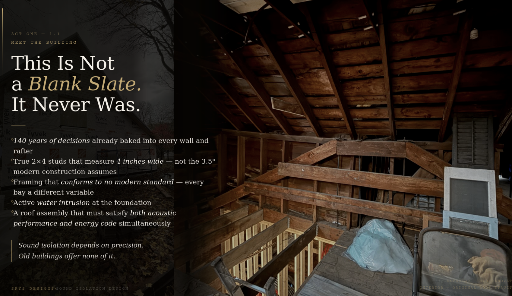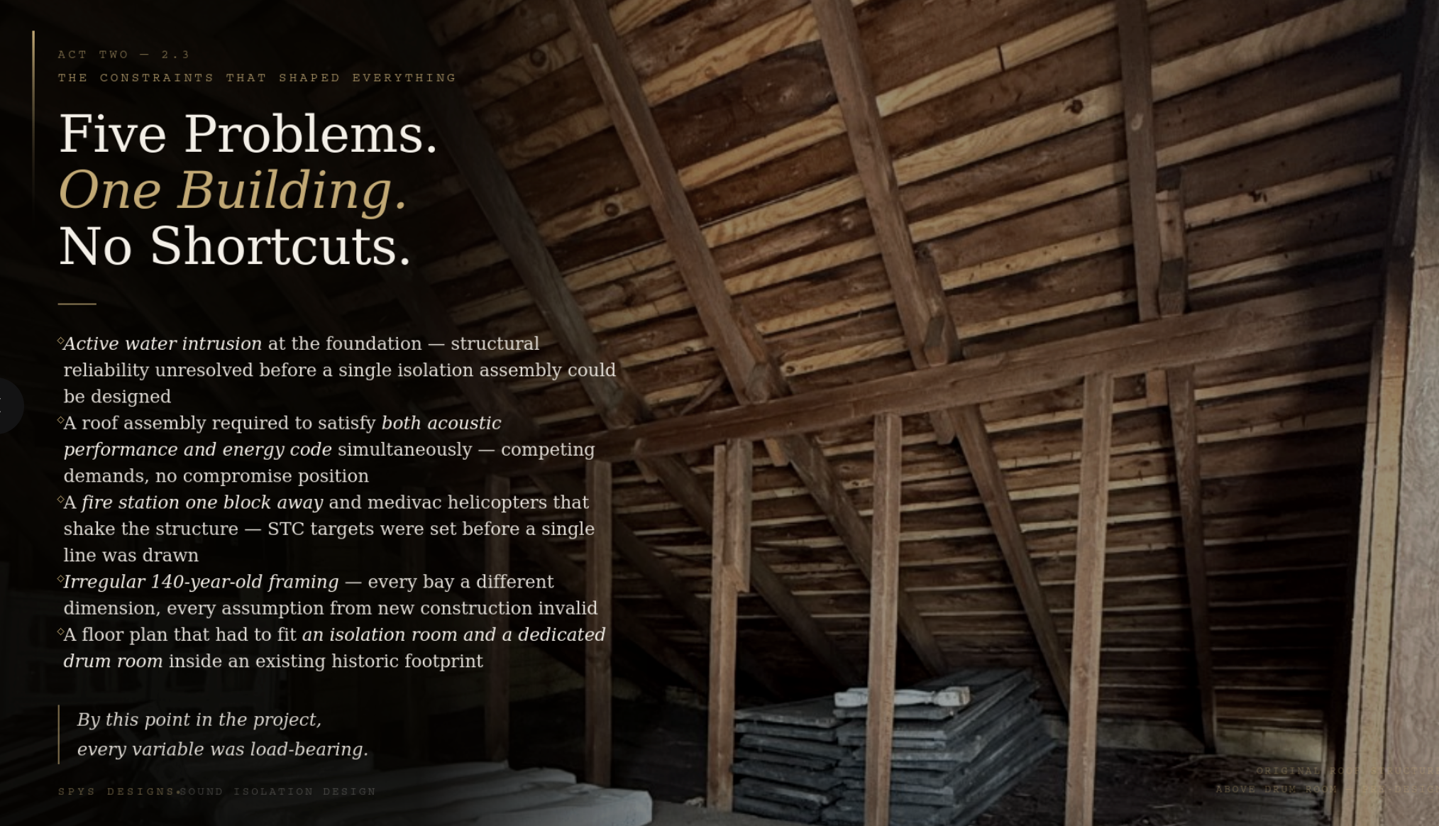 The framing was irregular throughout. Bay spacing that did not conform to any modern standard. Structural members in positions that made no sense by current building logic but made perfect sense for a building that was put together by hand in the late 1800s. A foundation with active water intrusion that had to be resolved before a single isolation assembly could be designed on top of it. And a roof structure that needed to satisfy both acoustic performance targets and modern energy code requirements simultaneously — two goals that do not naturally align and that had to be engineered into the same assembly.