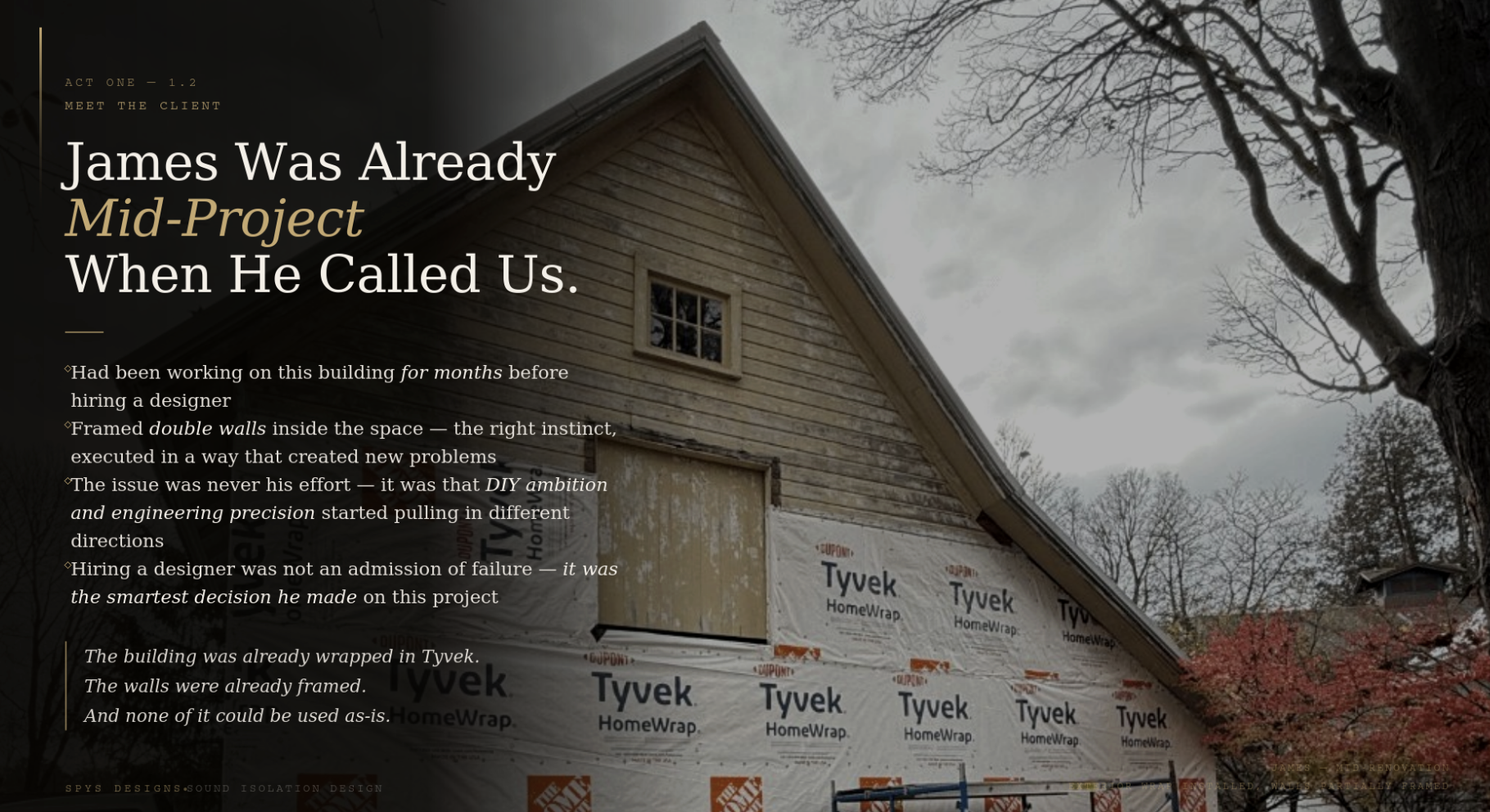 This is the moment that comes up on almost every project where a client has been doing their own work before hiring a designer. The effort is real. The knowledge is genuine. But there is a difference between understanding the principles of sound isolation and being able to translate those principles into a complete, coordinated set of construction documents that account for every system at once. James recognized that difference. Calling us was not an admission of failure. It was the smartest decision he made on this entire project.